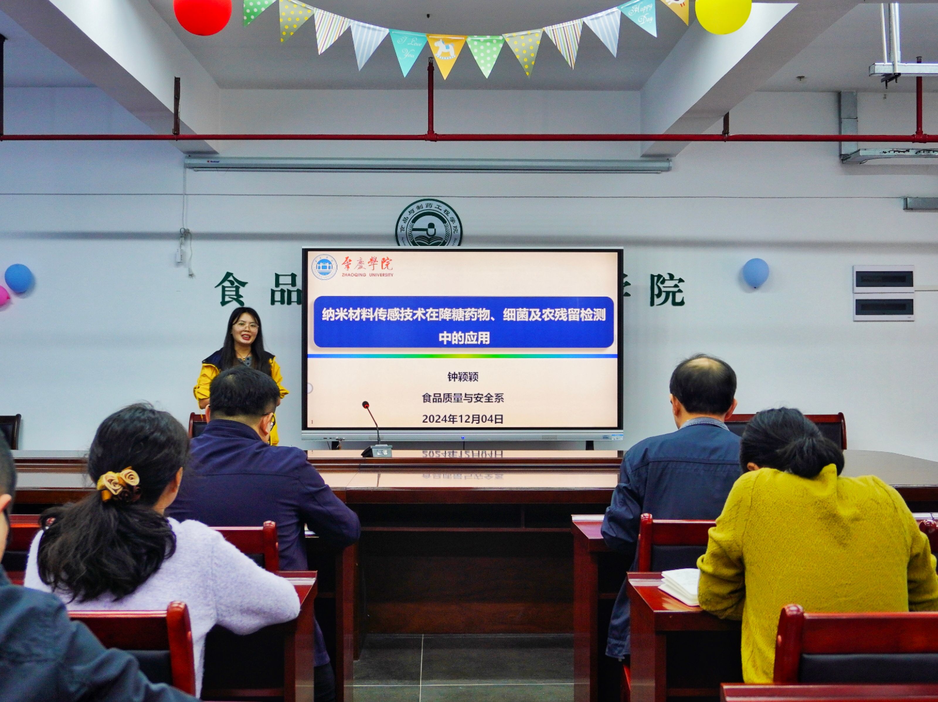 在讲座中,钟颖颖博士分享了其在纳米材料传感技术领域的研究工作,主要包括金属有机骨架固定化酶在降糖药物活性检测方面的应用、多功能纳米探针在食源性致病菌侧流免疫层析检测和抗菌方面的应用,以及纳米酶在农残留直接比色检测方面的应用。通过具体的案例分析和数据展示,让在座的各位老师、同学们更直观地了解了纳米材料传感技术在不同方面的应用潜力和前景。