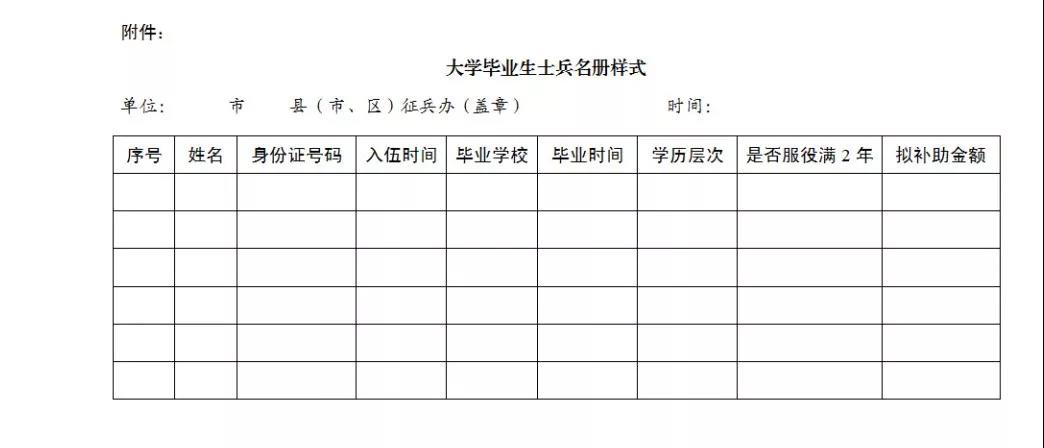 第八条 大学毕业生士兵服义务兵役2年后,由县级兵役机关将服满2年义务兵役的大学毕业生士兵名单通报同级退役军人事务部门,同级退役军人事务部门根据名单发放大学毕业生士兵入伍补助。