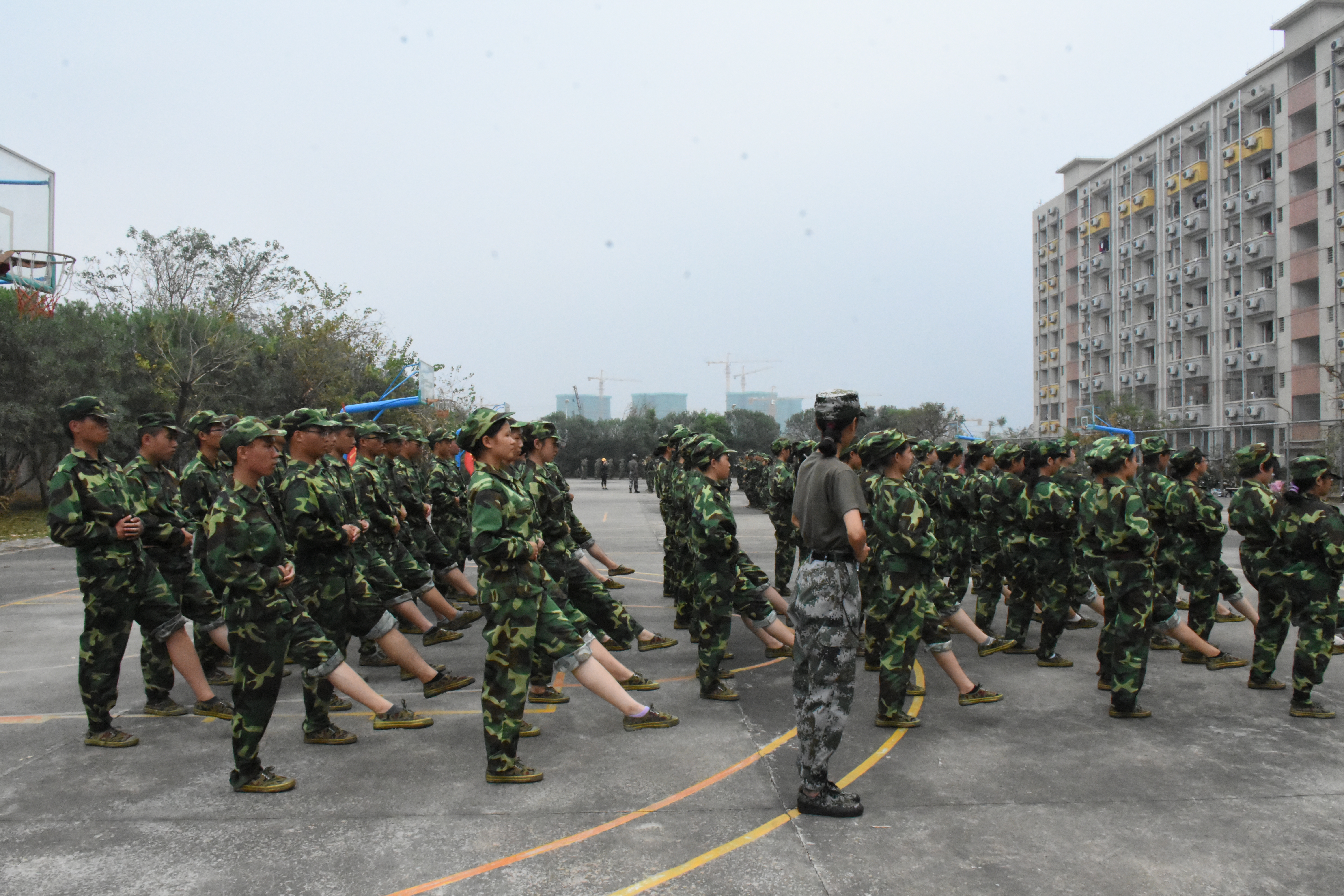 尽管赤日当空,但我院新生的热情不减。在训练场上,烈日与橄榄绿的迷彩军装相互辉映,增添了一道靓丽的风景。每天清晨,篮球场上总会传来一阵阵嘹亮的口号声和一首首高昂的军歌声。在学生教官的带领下,新生们每天都不厌其烦地学习齐步走、正步走、齐步变正步、解散、集合及分列式等预定训练科目。在学生教官严格操练下,新生们都严守军纪,认真地完成各项军训任务,充分地表现了当代大学生的精神风貌。挺直腰板站军姿,迈着坚定的步伐是新生们军训的真实写照,他们用实际行动来表明他们要实现“方队整齐,精神饱满,步伐矫健、口令准确、声音嘹亮。”这一目标的决心。在完成队列训练任务的同时,我院新生也完成了大学军事理论课、宿舍内务整理评比等规定项目。