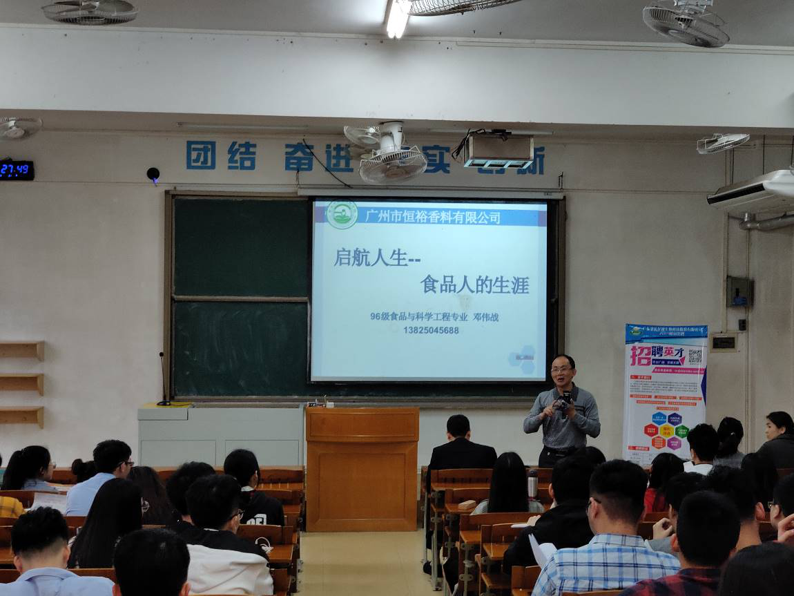 会上,邓伟战介绍了广州市恒裕香料有限公司的发展历史、经营模式以及未来规划等丰富内容,强调了香料添加市场对中国的重要性,阐述了食品和香料行业的发展趋势、市场环境,并着重分析了食品行业QA以及技术岗的就业前景、薪资待遇等。同时,他基于就业方法、技巧,结合20年职业生涯经历,建议同学们注重职业生涯规划,加强自身综合素质能力的培养。随后,蔡振治副书记鼓励同学们从技术岗位做起,制定好职业规划,一步一脚印,不畏困难,不断在个人职业发展的道路上奋勇向前。