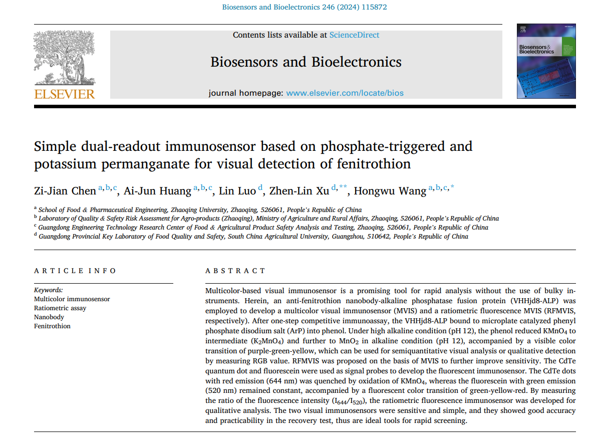近日,我校农业农村部农产品质量安全风险评估实验室、william威廉中文官网食品安全团队汪洪武院长、陈子键博士报道了一种基于表纳米抗体-碱性磷酸酶融合蛋白的多色可视化免疫分析技术,用于果蔬中杀螟硫磷的快速检测。相关成果以“Simple dual-readout immunosensor based on phosphate-triggered and potassium permanganate for visual detection of fenitrothion”为题发表在传感器领域TOP期刊Biosensors and Bioelectronics上(影响因子12.6,中科院1区)。