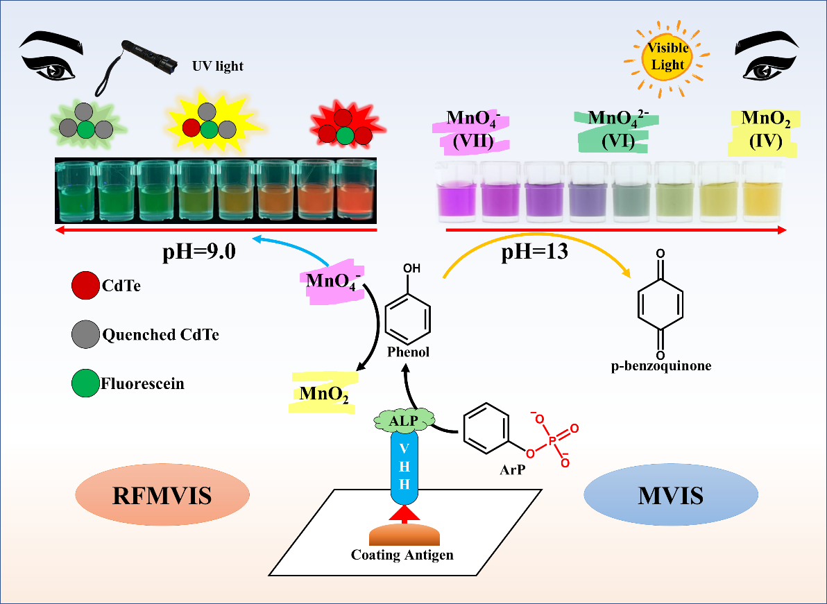 因此,该团队采用抗杀螟硫磷纳米体碱性磷酸酶融合蛋白(VHHjd8-ALP)开发了可视化多色和比率荧光免疫传感器。经过一步竞争免疫,在微孔板中结合VHHjd8-ALP催化磷酸苯二钠(ArP)生成苯酚。在高碱性条件下(pH=12),苯酚将KMnO4还原为中间体(K2MnO4),并进一步还原为MnO2,并伴随着紫色-绿色-黄色的颜色转换,可用于快速半定量裸眼分析或通过测量RGB值进行定性分析。为进一步提高灵敏度,使用CdTe量子点和荧光素作为信号探针来开发荧光免疫传感器。具有红色荧光的CdTe量子点通过被KMnO4氧化猝灭,而具有绿色荧光的荧光素保持稳定,并呈现绿-黄-红的荧光颜色转换。通过测量荧光强度的比率(I644/I520),开发了用于定性分析的比率荧光免疫传感器。这两种可视化免疫传感器灵敏、简单,在添加回收测试中显示出良好的准确性和实用性,是现场快速筛查的理想工具。