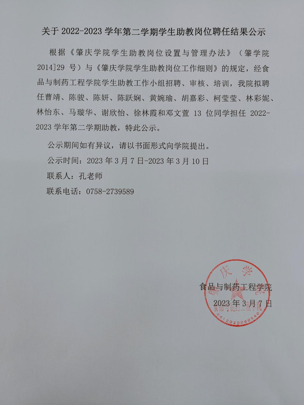 2022-2023学年第二学期学生助教岗位聘任结果公示